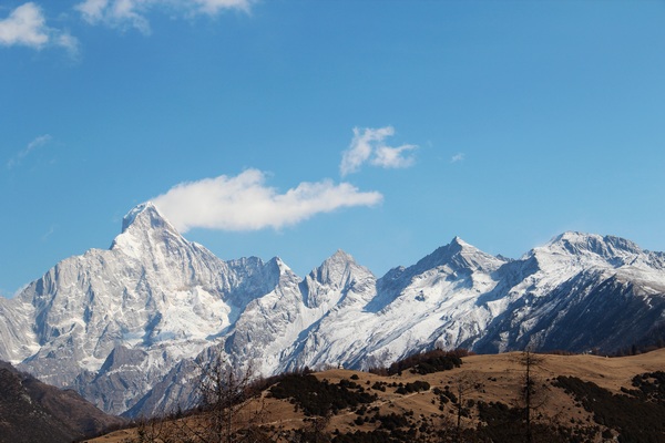 【目的地简介】:四姑娘山位于四川省阿坝州小金县与汶川县交界处,距成都市235千米,由四座边绵不断的山峰组成,它们从北到南,在3.5千米范围内一字排开,从幺姑娘、三姑娘、二姑娘到大姑娘,其高度分别为6250米,5664米、5454米,5035米,其中幺姑娘山峰是四川省阿坝州第一高峰。这四座山峰长年冰雪覆盖,如同姿容俏丽的四位少女亭亭玉立于长坪沟和海子沟两道银河上。四姑娘山中以幺妹身材最为苗条,姿容最为俊秀,与“蜀山之王”贡嘎山(7556米)遥遥相对,素有“蜀山之后”、“东方阿尔卑斯山”之称。这里终年积雪,冰清玉洁,根连地厚,峰插天高,白云浮玉,光摇烟霞,山麓下有5000多平方米的草坪,草坪上百花点点,是登山探险的理想场所。