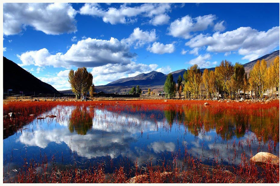 一早从稻城出发,前往桑堆的途中可以拍摄红草地(该景点为季节性景观,只有在每年的九月中旬到十一月上旬才能看到红草),在秋天的时候,配合上后面泛黄的桦树,倒映在水塘中,是非常漂亮的一道美景。之后再次翻越海子山自然保护区(平均海拔4500多米),在理塘用过午餐后,沿318国道一路向东,翻卡子拉山、剪子湾山、经雅江县城后,翻高尔寺山,抵达新都桥镇。